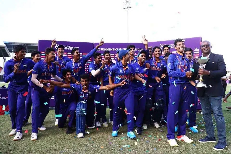 India secured their fifth ICC Under-19 World Cup title by defeating England by 4 wickets in the final held at North Sound on 5 February 2022. England, batting first, were restricted to 189 all out, with India’s bowlers maintaining consistent pressure throughout the innings. The standout performer was Raj Bawa, who produced a remarkable all-round display, claiming 5 wickets for 31 runs to dismantle England’s batting and prevent them from posting a more imposing total.